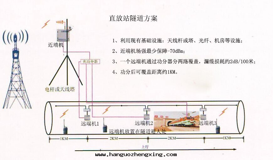 由(yóu)于(yú)隧道(dào)內(nèi)信(xìn)号(hào)衰减非常嚴重(zhòng),並(bìng)且隧道(dào)狹窄(zhǎi),不(bù)方(fāng)便安裝(zhuāng)定(dìng)向(xiàng)天(tiān)線(xiàn),天(tiān)線(xiàn)伴随着列車駛过(guò),安全行难以(yǐ)保障,因(yīn)此(cǐ),直(zhí)放(fàng)站+漏缆(lǎn)的(de)覆蓋是(shì)最(zuì)理(lǐ)想(xiǎng)的(de)可(kě)行的(de)方(fāng)案(àn)。充分(fēn)利用(yòng)現(xiàn)有(yǒu)的(de)基礎条(tiáo)件(jiàn),比如(rú)天(tiān)線(xiàn)杆、機(jī)房(fáng)、光(guāng)纖等設施,在(zài)隧道(dào)內(nèi)安裝(zhuāng)基站信(xìn)号(hào)增强器遠(yuǎn)端機(jī),隧道(dào)上(shàng)方(fāng)拉洩露(lù)電(diàn)缆(lǎn)的(de)方(fāng)式,遠(yuǎn)端機(jī)采用(yòng)光(guāng)纖分(fēn)體(tǐ)式,便于(yú)覆蓋多(duō)个(gè)隧道(dào)群(qún)。